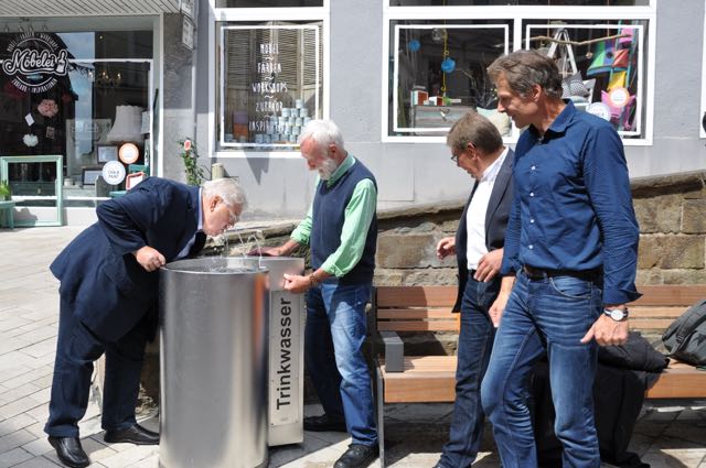 Minden. Mit einem „überparteilichen“ Schluck ist am vergangenen Freitag (14. Juli) der neue Trinkwasserbrunnen in der Obermarkstraße/Ecke Opferstraße eingeweiht worden. Der stellvertretende Bürgermeister Egon Stellbrink (CDU) und der Fraktionsvorsitzende von Bündnis 90/Grüne, Horst Idelberger, probierten das erfrischende Nass als erste. „Wasser ist unser wichtigstes Lebensmittel und es ist sehr wertvoll für unsere Gesundheit“, strich Stellbrink heraus.